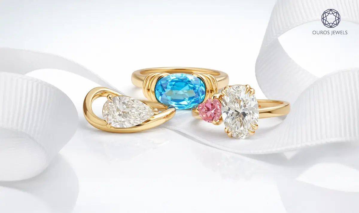 Most engagement rings orient their center stone vertically, tip pointing toward the fingernail, tip pointing toward the wrist. An east-west setting rotates the stone 90 degrees, so an elongated shape like a pear, emerald, or marquise runs horizontally across the finger instead. It’s a small change with a disproportionate visual impact. The ring reads as architectural and intentional rather than conventional, and it tends to sit lower on the finger, which suits people with active hands who catch rings on things constantly. (If that’s a concern, the Best Engagement Ring Settings for Active Lifestyle 2026 guide goes deeper on that specific consideration.)