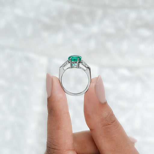 View full detailsGreen Emerald With Trapezoid cut Diamond three stone Ring